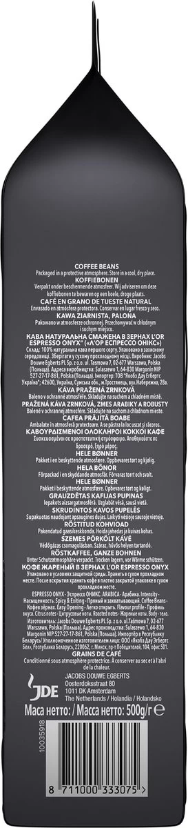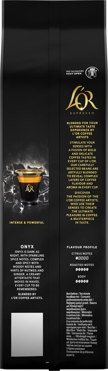 De intense L’OR Espresso Onyx is een ode aan de ultieme essentie van pure espresso: superieure, donker gebrande Arabica- en Robusta bonen zijn fijn gebrand om een uitgesproken en krachtige melange te onthullen. Dompel je onder in het donkerste karakter van espresso koffie.